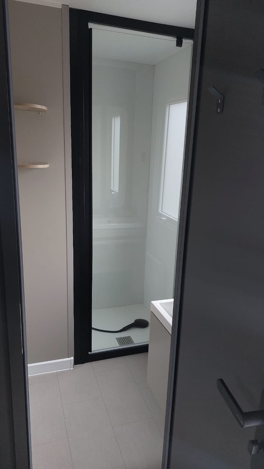 Hochwertige Dusche mit Waschbecken aus robusten Materialien. High-quality shower with washbasin made of robust materials. Hoogwaardige douche met wastafel van robuuste materialen. Douche de haute qualité avec lavabo en matériaux robustes.